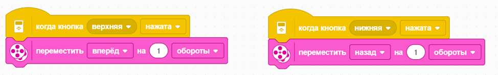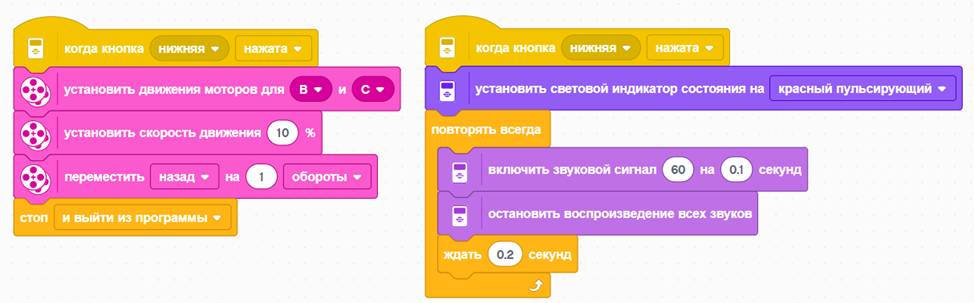 Рассмотрим другой случай. Есть задание «По нажатию нижней кнопки модуля - мигает красный свет + прерывистый звуковой сигнал (0.1 - звук + 0.2 - тишина) и робот едет назад на 1 оборот». Самый простой способ решать подобные задачи использовать параллельность.