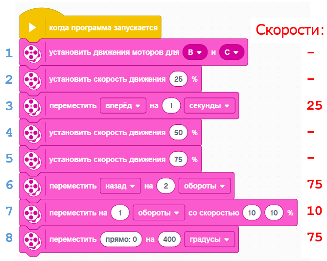 Первый блок не связан с мощностью, второй установил скорость на 25%. То есть следующие блоки будут использовать именно это значение, если не будет установлено новое. Третий блок запускает робота на 1 секунду вперед со скоростью 25%. Следующий блок изменяет это значение на 50%, но оно тут же меняется на 75% так ни разу не применившись. 6 блок перемещает робота назад на 2 оборота с мощностью 75%, следующий блок (7) не запрашивает установленную скорость, а использую свою собственную настройку и двигается на 1 оборот вперед со скоростью 10%. 8 блок будет использовать последнюю установленную скорость, а именно 75%.
